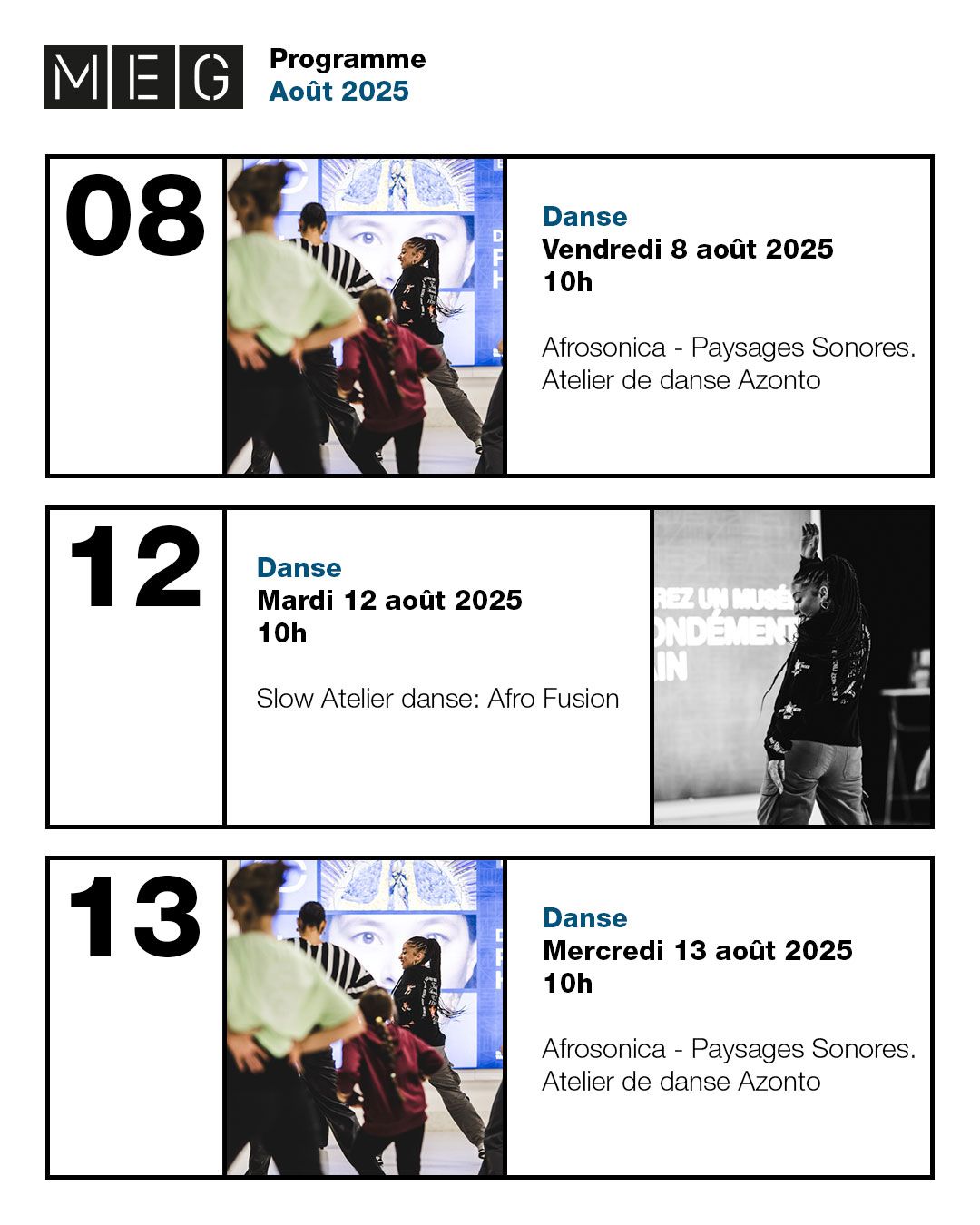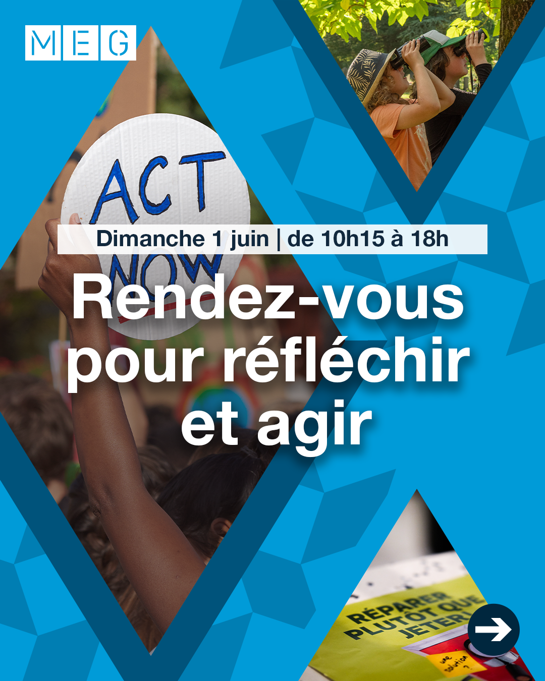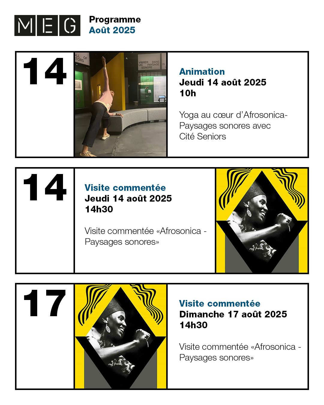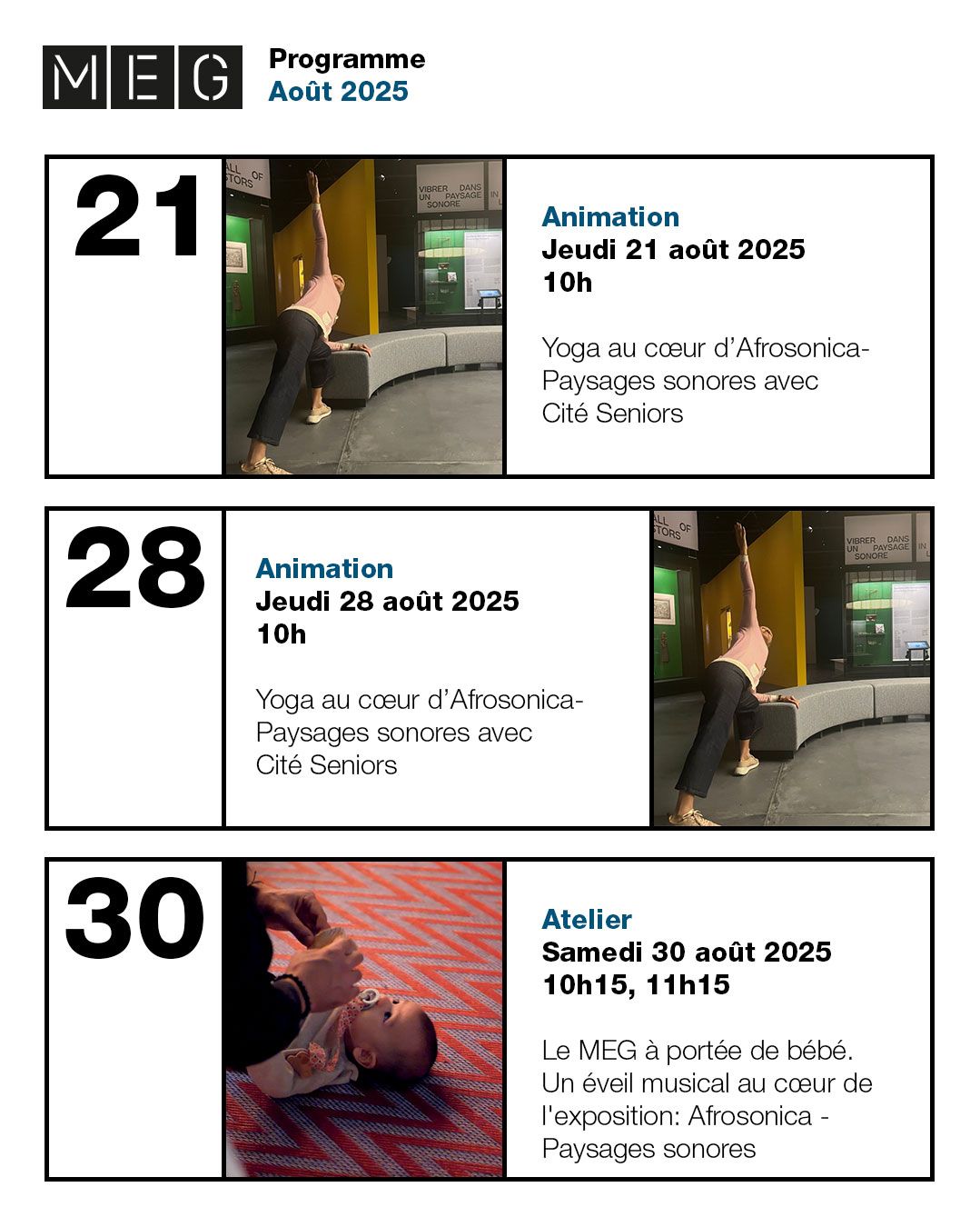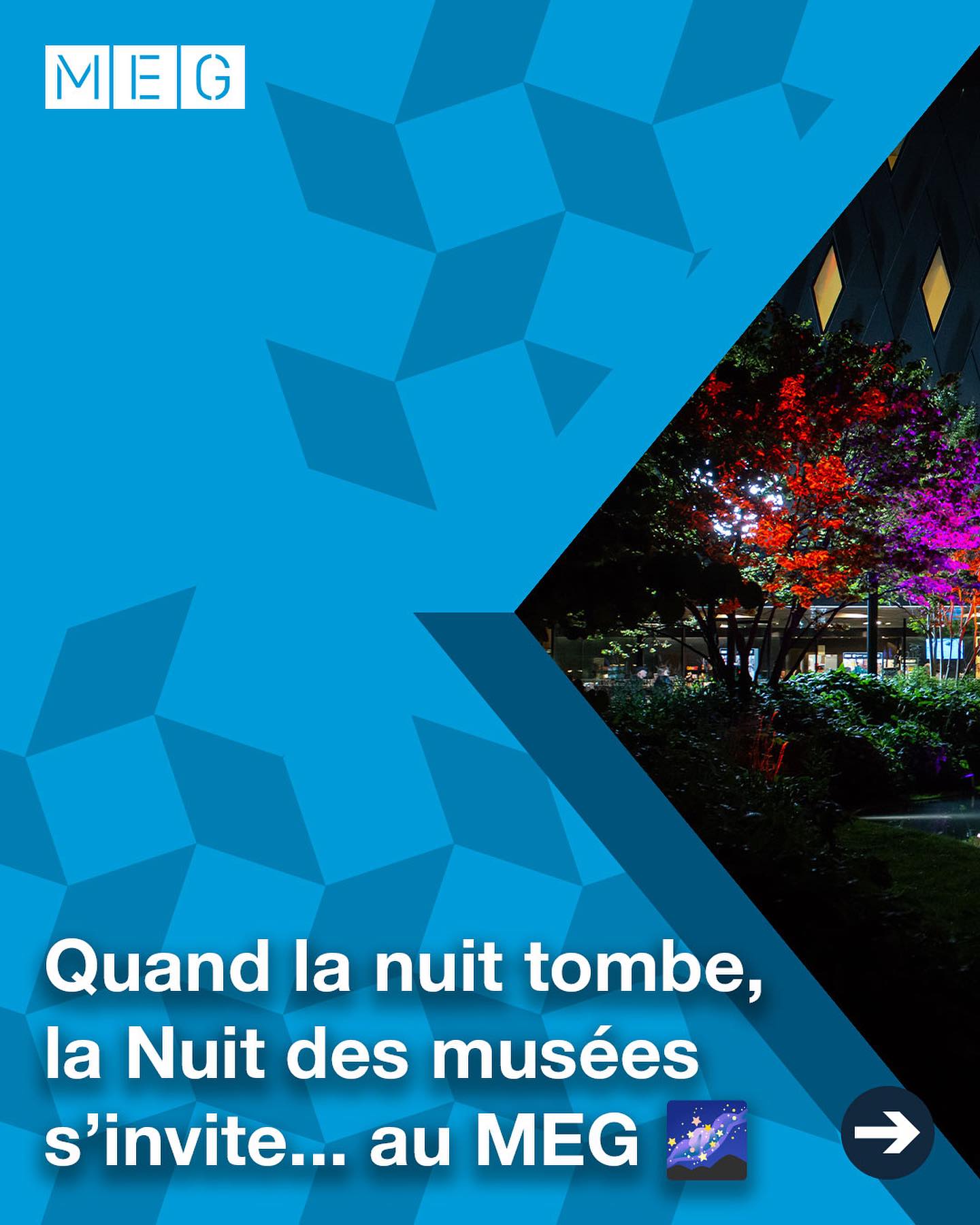 À partir de 2025, le MEG a développé une stratégie visant à créer un univers graphique autour de ses affiches. Sur cette base, j’ai conçu et décliné l’ensemble de la charte graphique numérique qui en découle.
